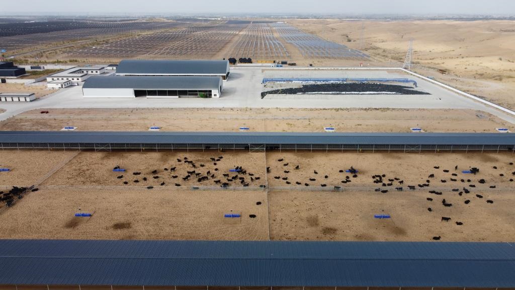 “這是我們在光伏基地打造的循環(huán)經(jīng)濟(jì)項目。”中畜科技有限公司肉牛標(biāo)準(zhǔn)化養(yǎng)殖場負(fù)責(zé)人石龍說,養(yǎng)殖場肉牛產(chǎn)生的糞便可以作為光伏基地板間種植作物的肥料,改善沙地土質(zhì)的同時還能促進(jìn)作物生長,而這些作物又能作為飼料供應(yīng)養(yǎng)殖場,循環(huán)發(fā)展的同時還能促進(jìn)沙漠生態(tài)改善。
