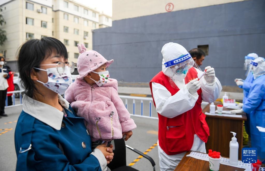 10月25日,在呼和浩特市賽罕區(qū)昭烏達南路街道惠民社區(qū)核酸檢測點,醫(yī)護人員為居民進行核酸檢測。