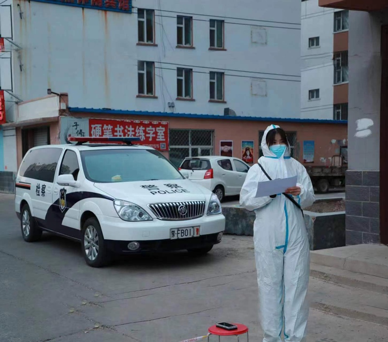 圖③內蒙古自治區(qū)檢察院興安盟分院干警在寒風中參與社區(qū)疫情防控。許百賀攝