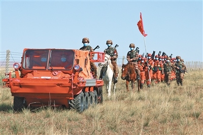 內(nèi)蒙古自治區(qū)森林消防總隊(duì)錫林郭勒盟支隊(duì)聯(lián)合解放軍邊防某連,在中蒙邊境一線開(kāi)展督察檢查、防火宣傳等防火專項(xiàng)行動(dòng),守好邊境線。本報(bào)記者懷特烏勒斯攝