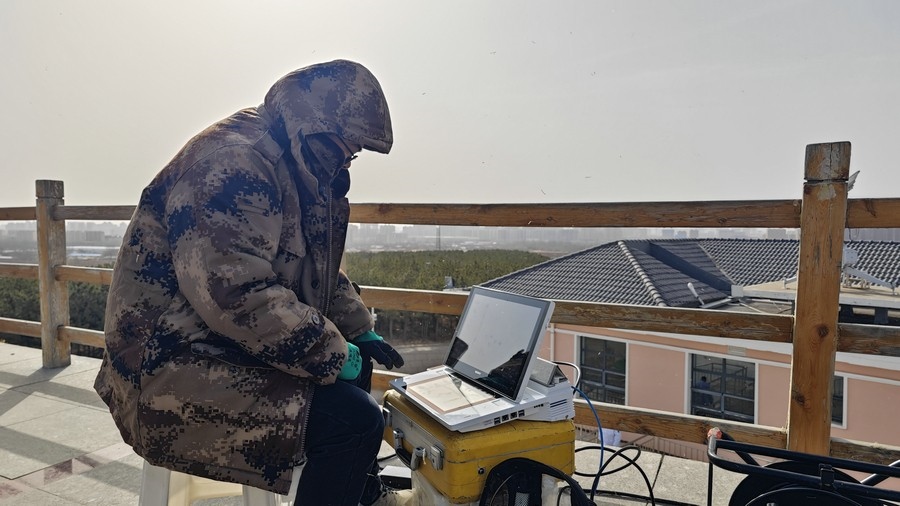 工作人員頂著大風(fēng)和沙塵在戶外工作 記者 張楊攝影