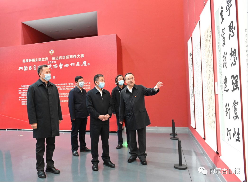 5月7日,孫紹騁來到內(nèi)蒙古美術(shù)館,參觀“扎實(shí)開展主題教育建功自治區(qū)兩件大事——2023年內(nèi)蒙古自治區(qū)政協(xié)書畫作品展”。