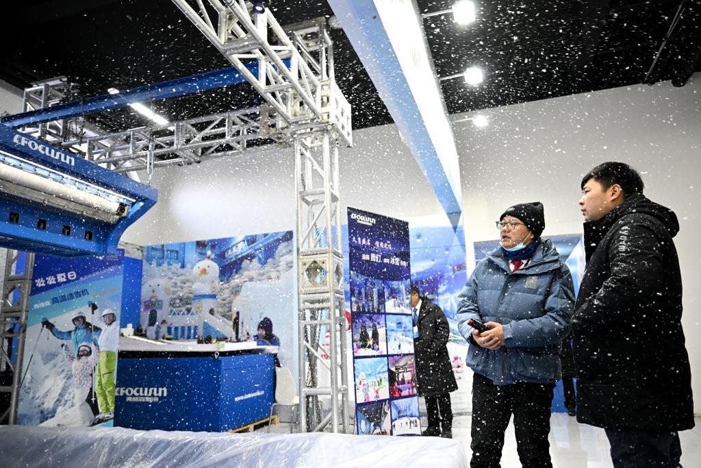 ??2023年12月16日,市民在展銷會上觀看飄雪機飄雪。當日,2023年首屆呼倫貝爾·海拉爾冰雪產品冬季展銷會在內蒙古呼倫貝爾市海拉爾區(qū)開幕。新華社記者 貝赫 攝