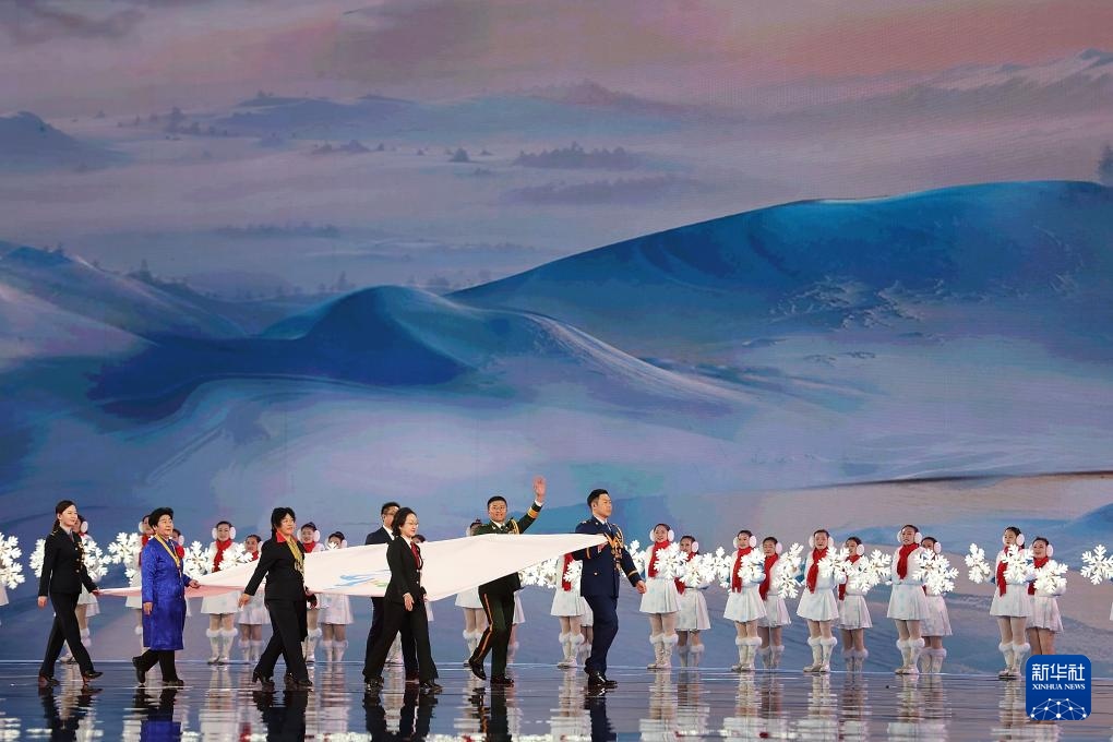 ??2月17日,中華人民共和國冬季運(yùn)動(dòng)會(huì)會(huì)旗在開幕式上入場。新華社記者 黃偉 攝