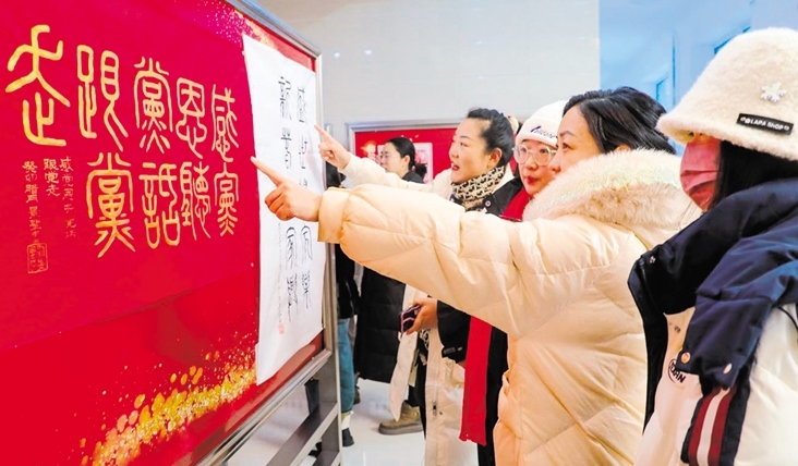 各類參展作品掛在以紅色為底的展板上,新年的氛圍感瞬間拉滿。“舉辦這次活動特別有意義,真的很喜歡這種文化氛圍?!眱?nèi)蒙古自治區(qū)第八屆道德模范獲得者鄭洪山邊看邊說。
