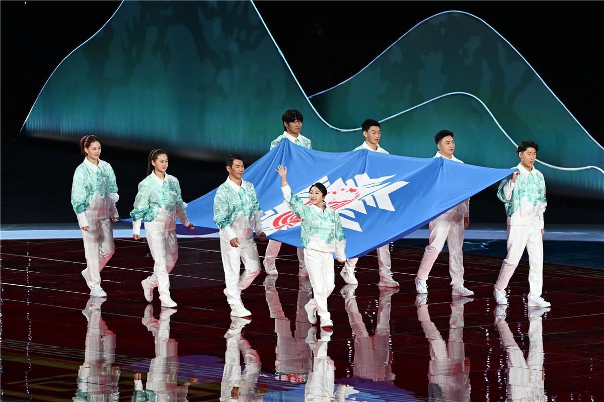 中華人民共和國第十四屆冬季運(yùn)動會會旗入場。
