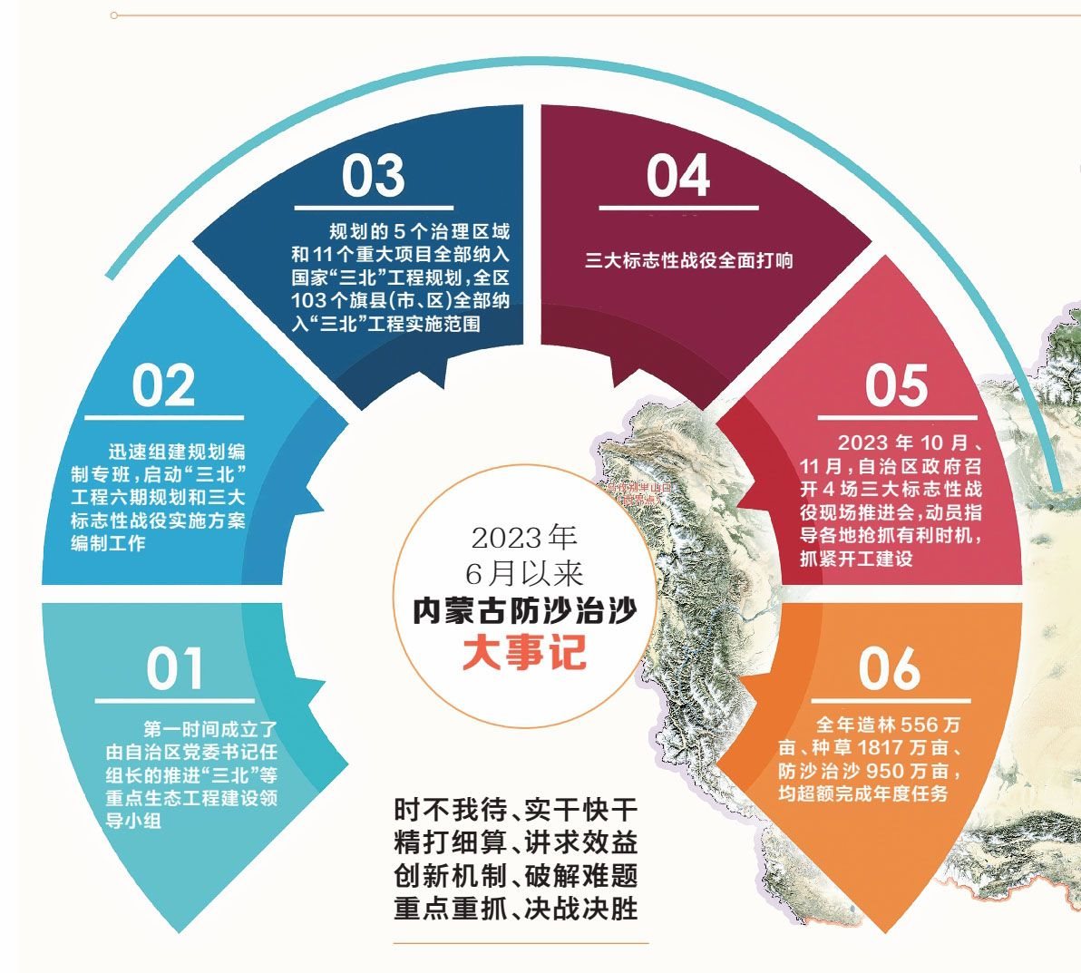 7月底,鄂爾多斯市率先打響黃河“幾字彎”攻堅(jiān)戰(zhàn);8月12日,赤峰市打響科爾沁、渾善達(dá)克兩大沙地殲滅戰(zhàn)“第一槍”;11月初,自治區(qū)打響河西走廊—塔克拉瑪干沙漠邊緣阻擊戰(zhàn)。