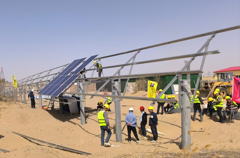 記者在新華林場民樂作業(yè)區(qū)看到,與其他作業(yè)區(qū)的造林治沙方式相比,這里既沒有栽樹,也沒有種草,而是在沙地里“栽”下了一個(gè)個(gè)水泥樁。葛文斌告訴記者:“這里是防沙治沙和風(fēng)電光伏一體化工程項(xiàng)目區(qū)?!浴鄻毒褪菫楹笃诎惭b光伏板、建設(shè)光伏電站做準(zhǔn)備。在光伏板上發(fā)電的同時(shí),我們還可以在光伏板下種植固沙植物,幫助地表植被恢復(fù),達(dá)到既能發(fā)電‘生金’又能實(shí)現(xiàn)沙化土地縮減的雙重功效。”(記者李云平、侯維軼)