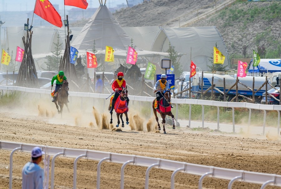 7月13日下午,內蒙古錫林浩特馬都核心區(qū)賽馬場,錫林浩特蒙古馬積分賽1000米速度賽和15公里接力賽正在這里輪番進行,比賽現(xiàn)場,選手們策馬奔騰,激戰(zhàn)正酣。
