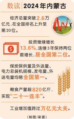 2024年,內(nèi)蒙古完成防沙治沙面積1954萬(wàn)畝;新能源建設(shè)領(lǐng)跑全國(guó),煤炭保供量及外送量、電力總裝機(jī)規(guī)模、發(fā)電量、外送電量均居全國(guó)第一,稀土產(chǎn)業(yè)產(chǎn)值突破千億元;糧食產(chǎn)量超820億斤,實(shí)現(xiàn)“二十一連豐”;陸路口岸貨運(yùn)量突破1.2億噸。