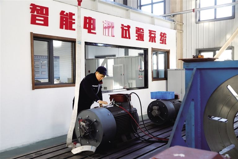 內(nèi)蒙古優(yōu)普森電氣有限公司生產(chǎn)車間內(nèi)一臺永磁電機(jī)正在進(jìn)行出廠前試驗。 記者 劉向平 攝