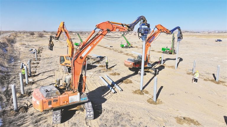引孔機(jī)、打樁機(jī)轟鳴聲不絕于耳,打樁機(jī)將一根根水泥樁“釘”入地面中……連日來,巴彥淖爾市臨河區(qū)新華林場防沙治沙和光伏一體化項目施工現(xiàn)場多臺作業(yè)車輛同時進(jìn)行樁基作業(yè),現(xiàn)場還不時有工作人員對打樁等基礎(chǔ)工作進(jìn)行抽檢抽查,確保施工質(zhì)量。