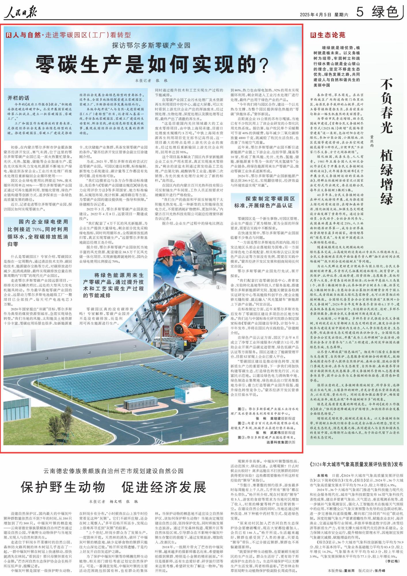 2025年4月5日,《人民日報(bào)》第5版刊發(fā)題為《探訪鄂爾多斯零碳產(chǎn)業(yè)園 零碳生產(chǎn)是如何實(shí)現(xiàn)的?》的文章,報(bào)道了鄂爾多斯零碳產(chǎn)業(yè)園通過可再生能源利用、智能化管理、綠色產(chǎn)業(yè)鏈構(gòu)建等創(chuàng)新方式,逐步探索出一條綠色高質(zhì)量發(fā)展的路徑。