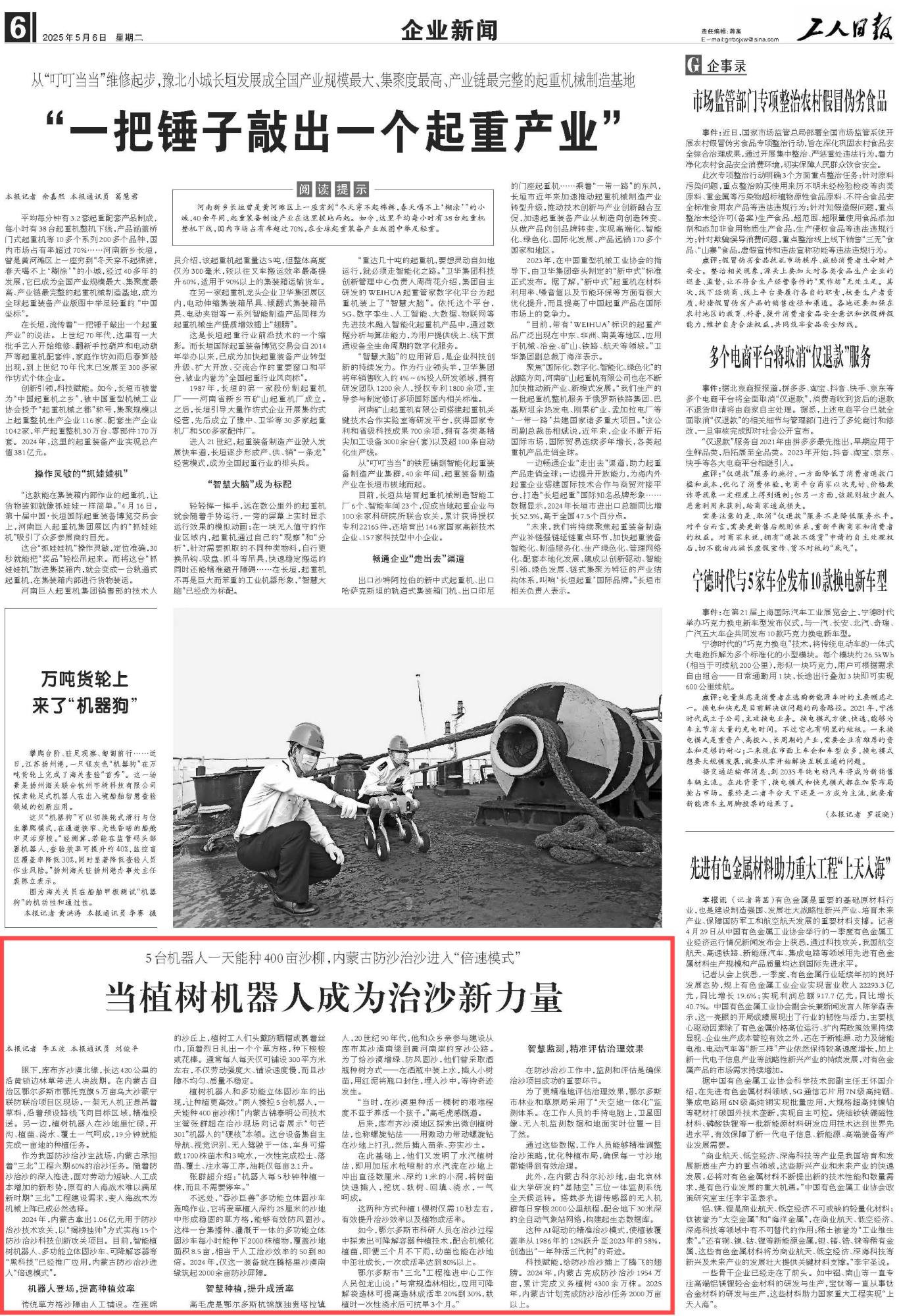 2025年5月6日,《工人日報(bào)》第6版刊發(fā)題為《當(dāng)植樹機(jī)器人成為治沙新力量》的文章,報(bào)道了內(nèi)蒙古作為我國防沙治沙主戰(zhàn)場,承擔(dān)著“三北”工程六期60%的治沙任務(wù)。隨著防沙治沙的深入推進(jìn),智能植樹機(jī)器人、多功能立體固沙車、可降解容器等“黑科技”已經(jīng)推廣應(yīng)用,內(nèi)蒙古防沙治沙進(jìn)入“倍速模式”。