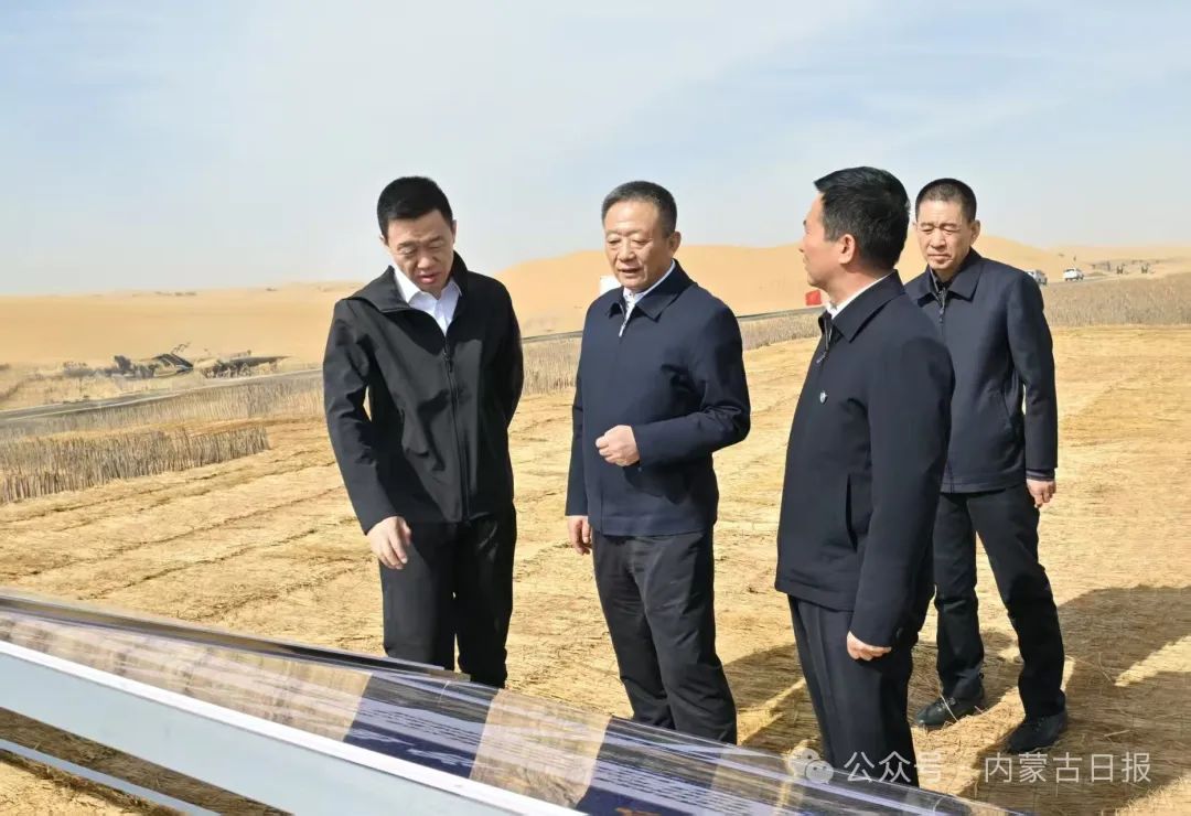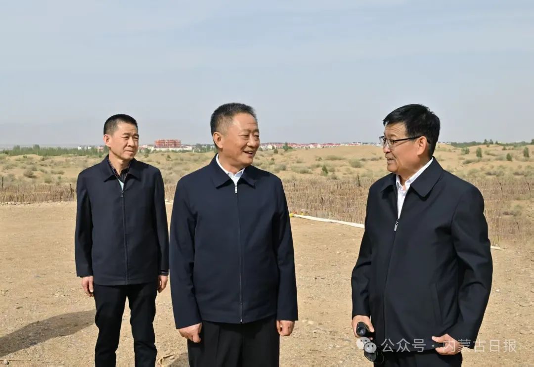 5月11日,自治區(qū)黨委書(shū)記孫紹騁在杭錦旗獨(dú)貴塔拉鎮(zhèn)沙日召嘎查重點(diǎn)了解庫(kù)布其沙漠北緣鎖邊林草帶布局和入黃泥沙減少、生態(tài)用水保障等情況。草原云·內(nèi)蒙古新聞網(wǎng)記者