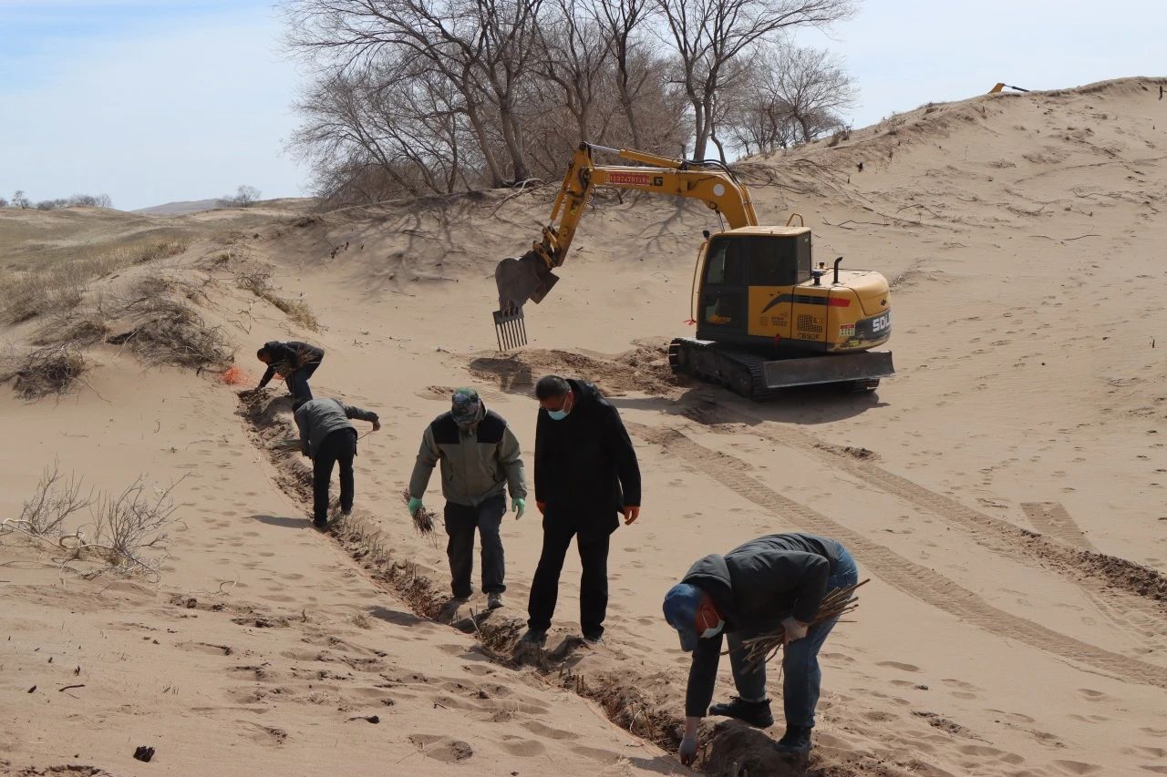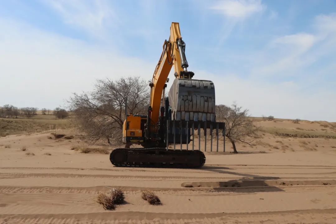 據(jù)錫林浩特市二蛋牧民養(yǎng)殖專業(yè)合作社負(fù)責(zé)人介紹,在傳統(tǒng)的沙漠治理作業(yè)中,工人需要手動(dòng)栽植黃柳等固沙植物。然而,人工種植不僅效率低,勞動(dòng)強(qiáng)度也大。為突破這一困境,合作社成員經(jīng)過多次試驗(yàn),最終決定對(duì)挖掘機(jī)進(jìn)行創(chuàng)新改造,加裝叉具,這一巧妙的設(shè)計(jì)不僅實(shí)現(xiàn)了對(duì)黃柳種植深度和間距的精準(zhǔn)把控,還能有效避免土壤翻動(dòng),最大程度地保持了土壤水分,切實(shí)保護(hù)了沙地的生態(tài)環(huán)境。