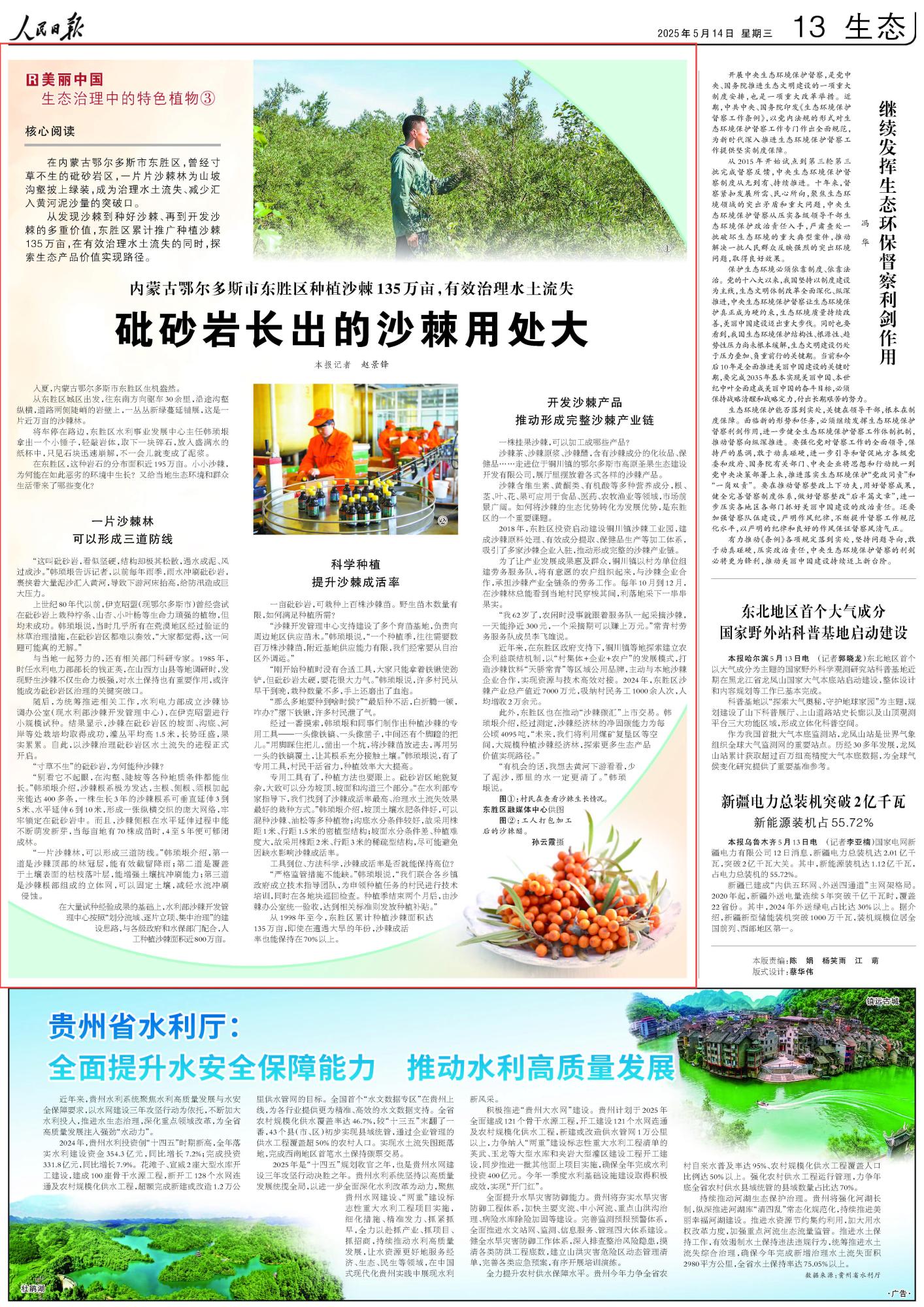 2025年5月14日《人民日報》第13版刊發(fā)了《內(nèi)蒙古鄂爾多斯市東勝區(qū)種植沙棘135萬畝,有效治理水土流失 砒砂巖長出的沙棘用處大》的文章,報道了內(nèi)蒙古鄂爾多斯市東勝區(qū)累計推廣種植沙棘135萬畝,在有效治理水土流失的同時,探索生態(tài)產(chǎn)品價值實(shí)現(xiàn)路徑。
