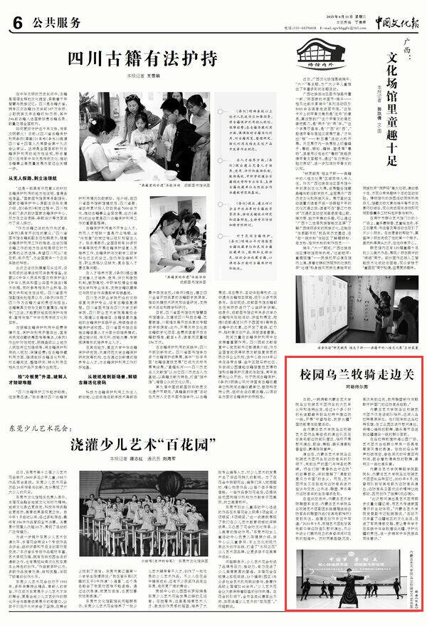 2025年6月11日,《中國文化報(bào)》第6版刊發(fā)題為《校園烏蘭牧騎走邊關(guān)》的文章,報(bào)道了內(nèi)蒙古藝術(shù)學(xué)院烏蘭牧騎藝術(shù)團(tuán)師生來到烏拉特中旗邊防一線,開展慰問演出,歌曲、舞蹈、器樂演奏輪番登場,贏得陣陣掌聲。