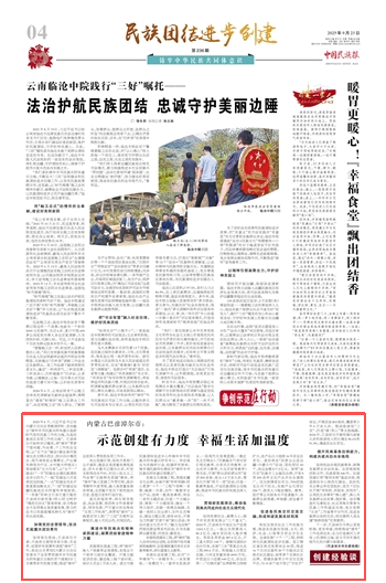 2025年9月23日,《中國民族報》第4版刊發(fā)題為《內(nèi)蒙古巴彥淖爾市:示范創(chuàng)建有力度 幸福生活加溫度》的文章,報道了2023年6月,習近平總書記在內(nèi)蒙古自治區(qū)考察調(diào)研時,首次提出“鑄牢中華民族共同體意識是新時代黨的民族工作的主線,也是民族地區(qū)各項工作的主線”。巴彥淖爾市始終牢記囑托,將“鑄牢”貫穿于想問題、作決策、干工作的全過程。