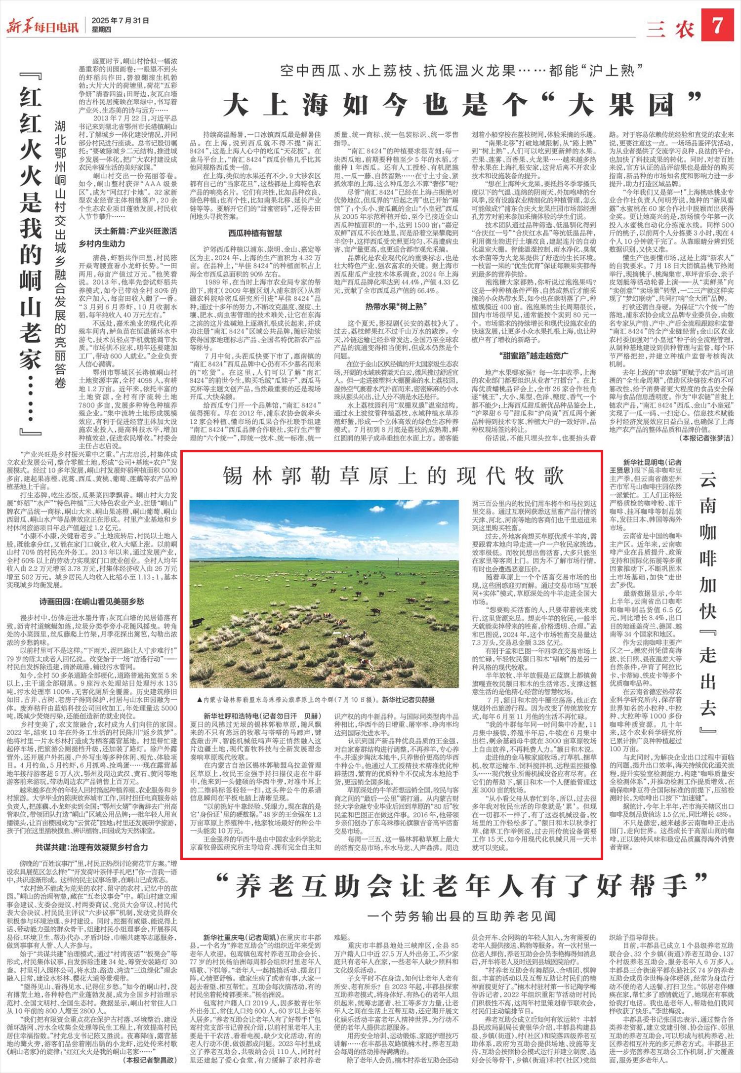 2025年7月31日,《新華每日電訊》第7版刊發(fā)題為《錫林郭勒草原上的現(xiàn)代牧歌》的文章,報(bào)道了夏日的風(fēng)拂過(guò)無(wú)垠的錫林郭勒草原,隨風(fēng)飄來(lái)的不只有悠遠(yuǎn)的牧歌與嗒嗒的馬蹄聲,鍵盤敲擊聲、智能機(jī)械低鳴聲等正悄然融入這片邊疆土地,現(xiàn)代畜牧科技與全新發(fā)展理念奏響草原現(xiàn)代牧歌。