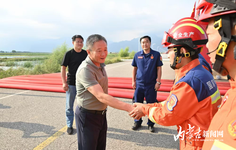 8月23日,自治區(qū)黨委書記孫紹騁在哈素海強排區(qū)沿著堤壩逐一看望連日堅守崗位的應急救援人員。草原云·內(nèi)蒙古新聞網(wǎng)記者 馬建兵 攝