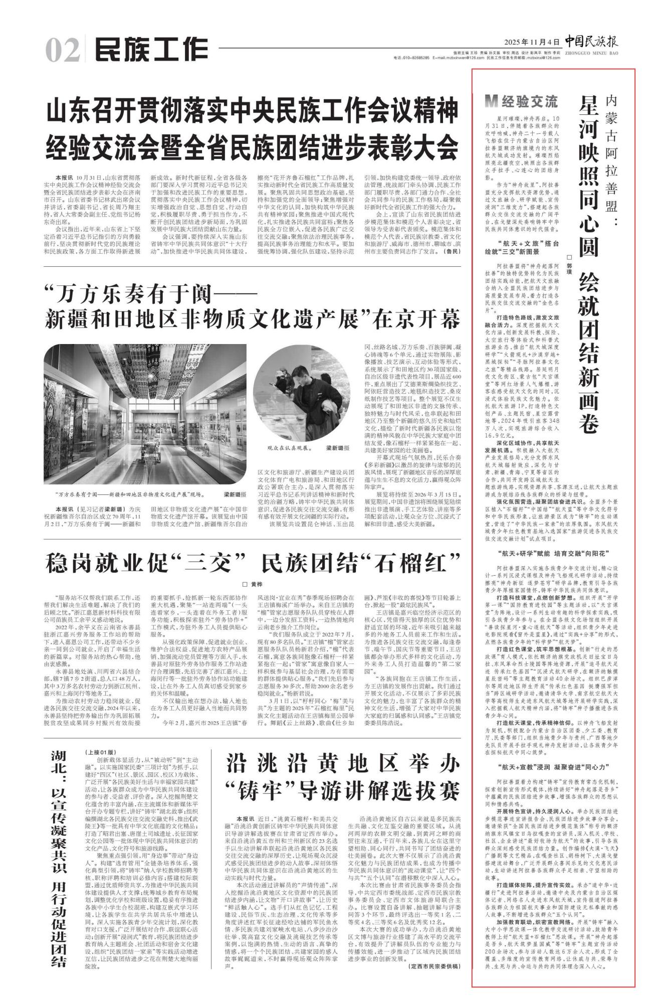 2025年11月4日,《中國民族報》第2版刊發(fā)題為《內(nèi)蒙古阿拉善盟:星河映照同心圓 繪就團(tuán)結(jié)新畫卷》的文章,報道了伴隨著各族群眾的歡呼吶喊,神舟二十一號載人飛船在位于內(nèi)蒙古自治區(qū)阿拉善盟額濟(jì)納旗境內(nèi)的東風(fēng)航天城成功發(fā)射。璀璨烈焰照亮北疆夜空,映照出各族群眾手拉手、心連心的團(tuán)結(jié)身影。