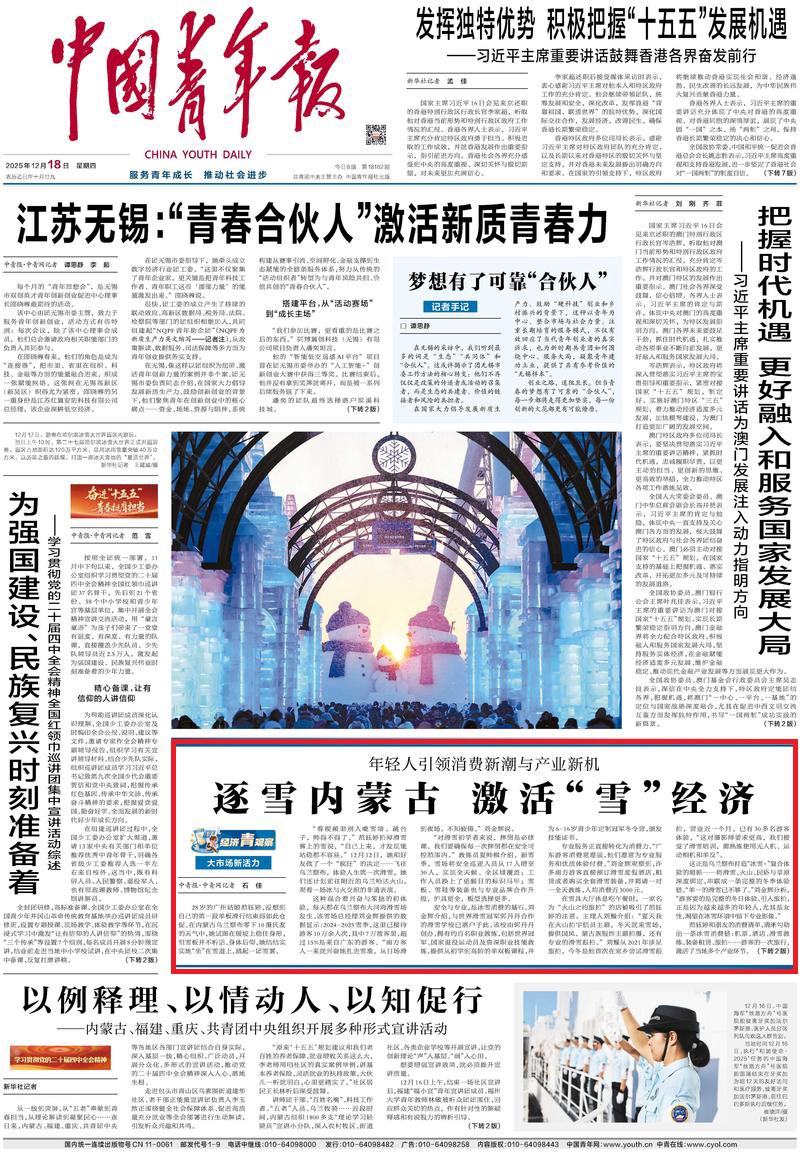 2025年12月18日《中國(guó)青年報(bào)》第1版刊發(fā)了《大市場(chǎng)新活力 年輕人引領(lǐng)消費(fèi)新潮與產(chǎn)業(yè)新機(jī) 逐雪內(nèi)蒙古 激活“雪”經(jīng)濟(jì)》的文章,報(bào)道了烏蘭察布大河灣滑雪場(chǎng)是打造“冰雪+”復(fù)合體驗(yàn)的縮影——將滑雪、火山、民俗與草原深度綁定,串聯(lián)成一條完整的冬季體驗(yàn)鏈。
