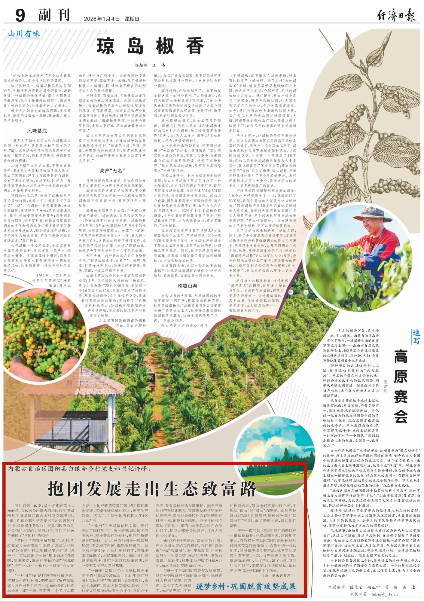 2026年1月4日,《經(jīng)濟日報》第9版刊發(fā)題為《內(nèi)蒙古自治區(qū)固陽縣白銀合套村黨支部書記許峰:抱團發(fā)展走出生態(tài)致富路》的文章,介紹了內(nèi)蒙古自治區(qū)固陽縣白銀合套村通過種養(yǎng)結(jié)合、資源高效利用、產(chǎn)業(yè)協(xié)同發(fā)展的良性循環(huán),把“資源鏈”擰成“致富鏈”,推動經(jīng)濟與生態(tài)效益雙贏的做法。