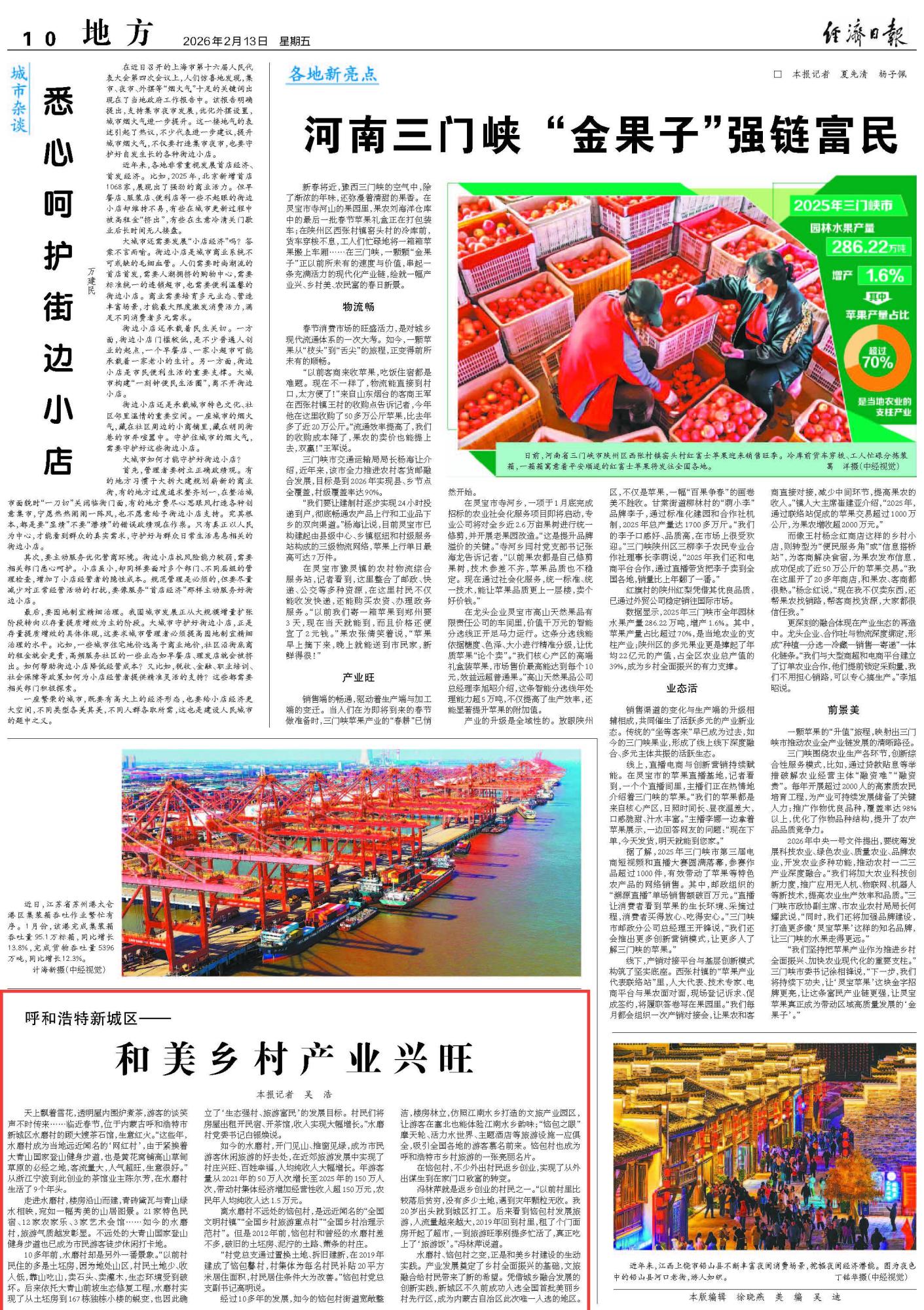 2026年2月13日《經(jīng)濟(jì)日報》第10版刊發(fā)了《呼和浩特新城區(qū)——和美鄉(xiāng)村產(chǎn)業(yè)興旺》的文章,報道了內(nèi)蒙古呼和浩特市新城區(qū)水磨村、惱包村之變,是和美鄉(xiāng)村建設(shè)的生動實(shí)踐。新城區(qū)成功入選全國首批美麗鄉(xiāng)村先行區(qū),成為內(nèi)蒙古自治區(qū)此次唯一入選的地區(qū)。產(chǎn)業(yè)發(fā)展奠定了鄉(xiāng)村全面振興的基礎(chǔ),文旅融合給村民帶來了新的希望。