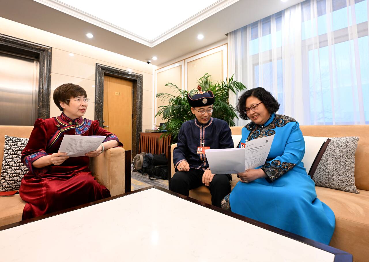 3月4日,住內(nèi)蒙古全國政協(xié)委員杜明燕(右)、納日碧力戈(中)、鄂曉梅(左)就全國政協(xié)常委會工作報(bào)告中共同關(guān)注的話題進(jìn)行交流。草原云記者 韓卿立