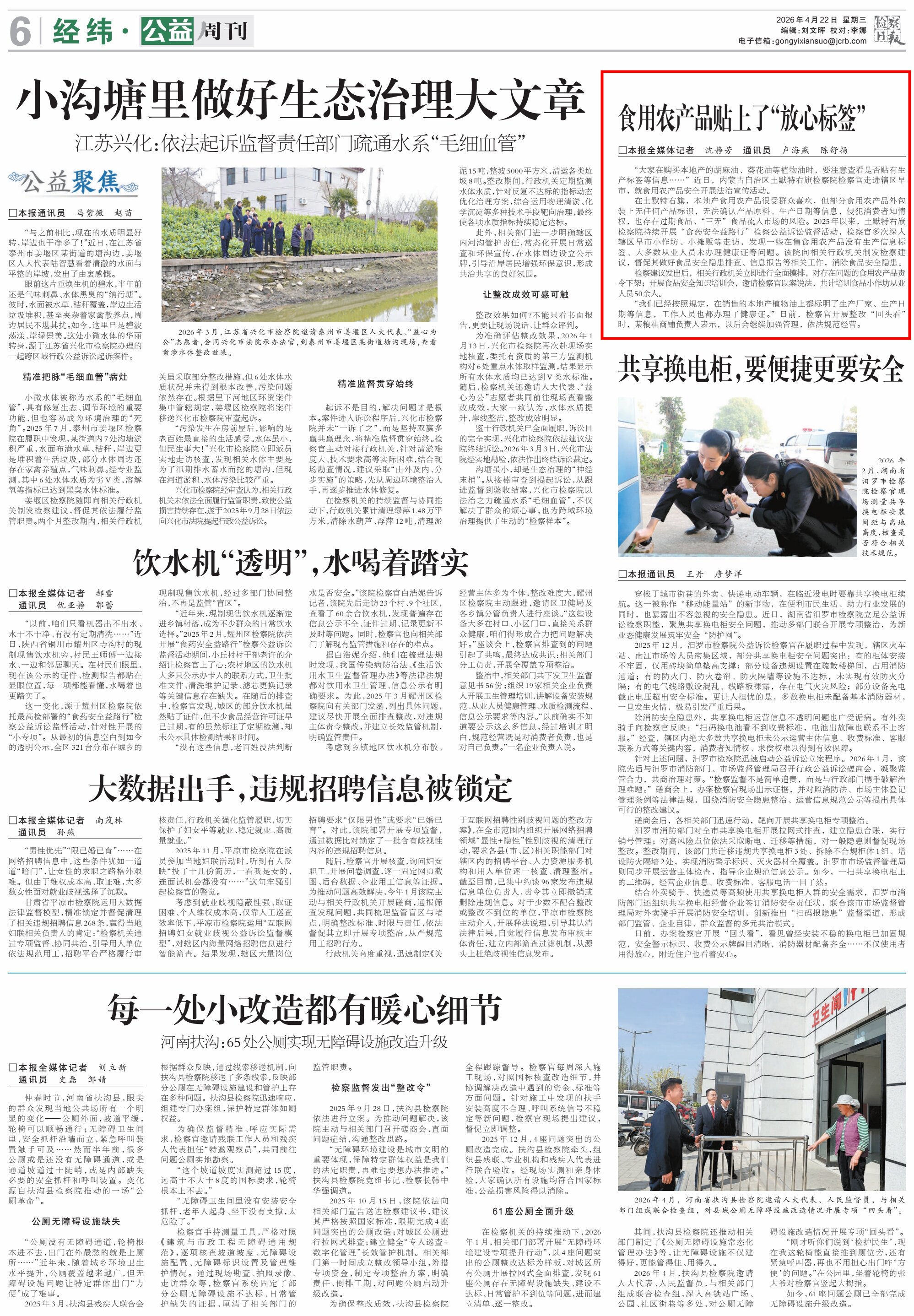 2026年4月22日,《檢察日報》第6版刊發(fā)題為《食用農(nóng)產(chǎn)品貼上了“放心標簽”》的文章,報道了內蒙古自治區(qū)土默特右旗檢察院檢察官走進轄區(qū)早市,就食用農(nóng)產(chǎn)品安全開展法治宣傳活動。