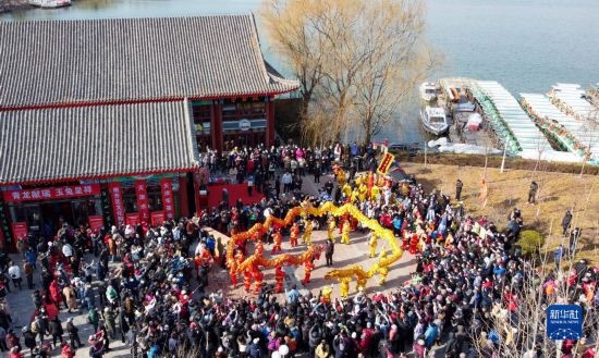 2月21日,在天津市水上公園,民間藝人表演空竹舞龍(無(wú)人機(jī)照片)。