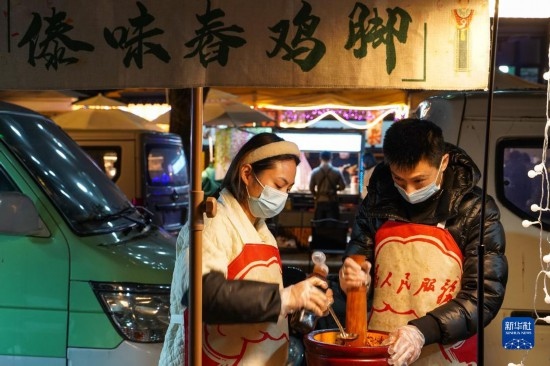 在四川省成都市錦江區(qū)三色路夜市,市民在購(gòu)買(mǎi)小吃(2月28日攝)。