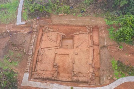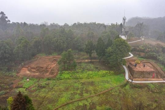 這是2月9日在重慶合川釣魚(yú)城遺址拍攝的新發(fā)掘出的類(lèi)似闕臺(tái)建筑的基址(無(wú)人機(jī)照片)。新華社記者 黃偉 攝