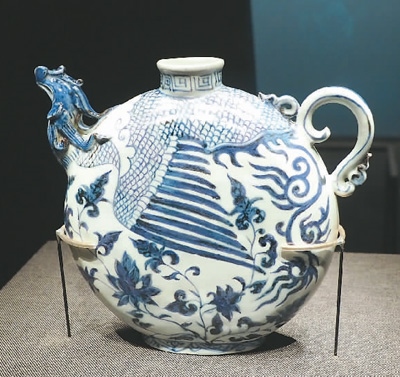 一件精美的青花鳳首扁壺引人注目。此壺出土于北京舊鼓樓大街豁口以東一處元代院落遺址。壺身為扁圓形,以鳳首為流,鳳尾作柄,用青料在壺身上繪出展翅飛翔的鳳鳥,器形與紋飾渾然一體,構(gòu)思精絕。“這是首都博物館收藏的國(guó)家一級(jí)文物?!闭挛挠勒f(shuō),“青花瓷體現(xiàn)了元代承接唐宋并對(duì)不同文化兼容并蓄的時(shí)代氣象,元大都正是在這種氛圍中誕生的偉大杰作?!?/P>