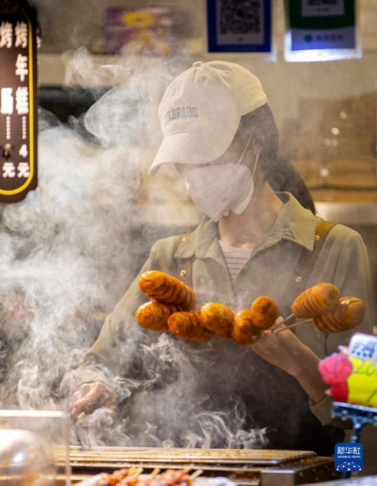 5月2日,商戶(hù)在寧夏銀川市金鳳區(qū)閱彩城中街制作特色美食。