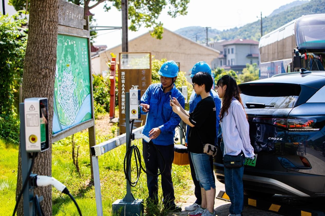 國家電網(wǎng)浙江寧波供電公司員工為電動車主提供現(xiàn)場充電指導,引導往來車輛有序充電,為綠色旅行提供全方位服務。胡云杰/攝