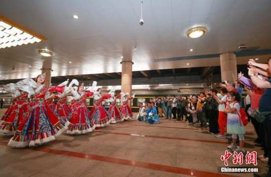 5月28日,北京援藏重點支持項目——2023年首趟“心連心·京藏號”旅游列車載著400多名游客從北京西站發(fā)車。該旅游列車全程共計14天,將途經(jīng)西寧、拉薩、林芝、山南等地。圖為舞蹈演員在站臺上跳起藏族舞蹈為游客送行。