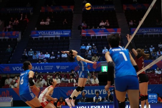 6月2日,中國(guó)隊(duì)球員袁心玥(中)在比賽中扣球。新華社記者 張笑宇 攝