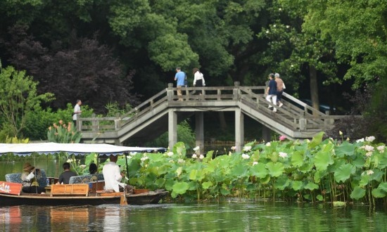 6月11日,游客在曲院風荷景區(qū)欣賞荷花(無人機照片)。
