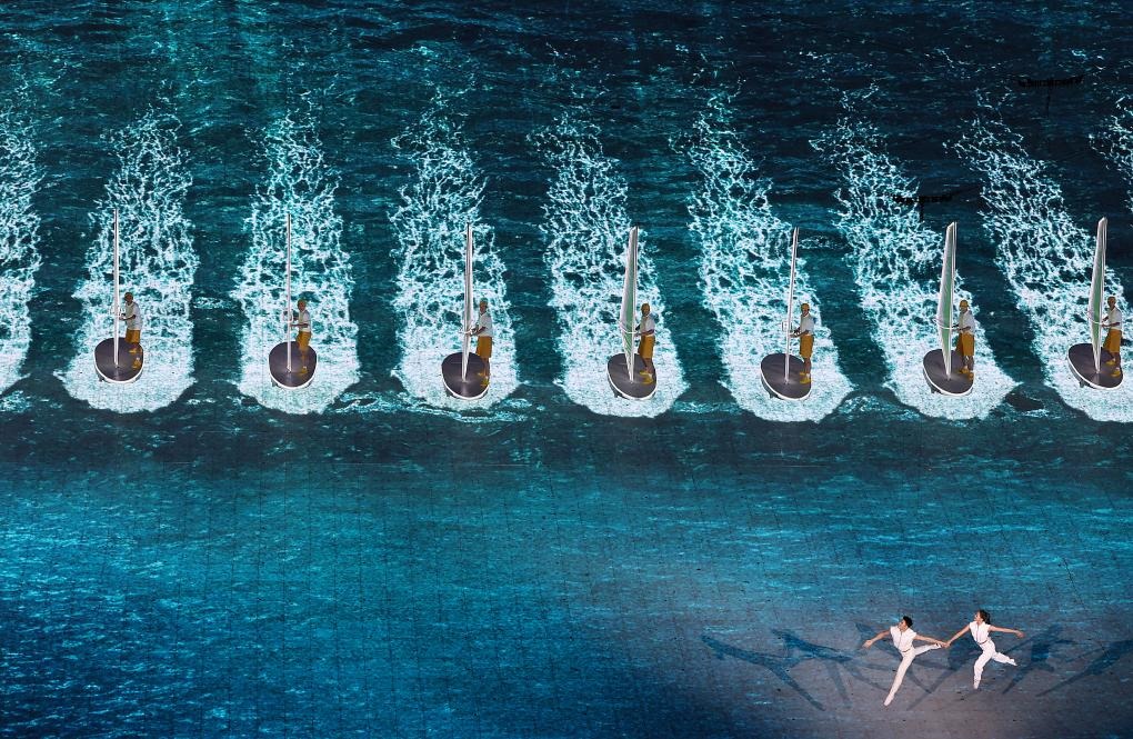 本屆亞運(yùn)會(huì)首次將3D雙威亞技術(shù)應(yīng)用于大型運(yùn)動(dòng)場中。立體飛旋于空中的男女演員與潮共舞,吊著威亞的他們在空中完成了各種高難度動(dòng)作,并與地屏中的浪潮實(shí)時(shí)互動(dòng),踏浪而行,成就了科技與藝術(shù)完美融合。