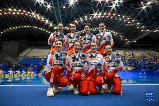 7月21日,中國隊(duì)在頒獎儀式上。當(dāng)日,在日本福岡舉行2023年世界游泳錦標(biāo)賽花樣游泳集體自由自選決賽中,中國隊(duì)以329.1687分的成績獲得冠軍。新華社記者 夏一方 攝