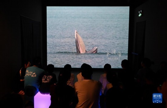 8月26日,游客在國(guó)家海洋博物館“鯨奇物語(yǔ)”展區(qū)觀看鯨魚相關(guān)科普視頻。
