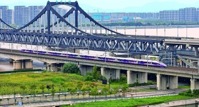 10月3日,亞運涂裝復興號智能動車組從杭州東站發(fā)出,穿過錢塘江。本報記者 陳城攝/光明圖片