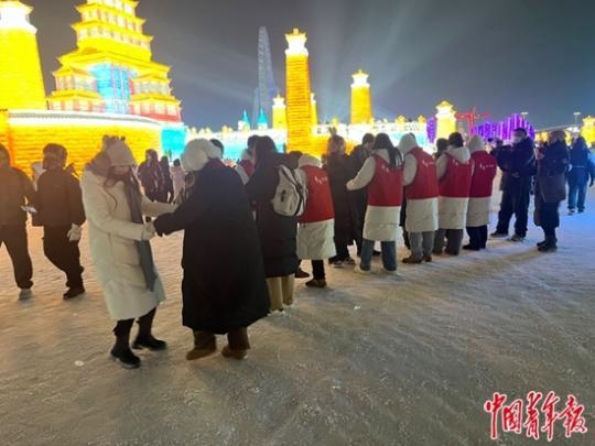 1月4日,哈爾濱冰雪大世界,大學(xué)生志愿者與游客一起跳兔子舞。中青報(bào)·中青網(wǎng)記者 金卓攝