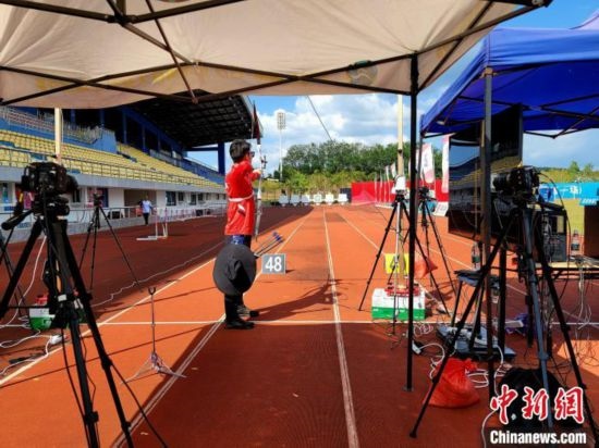 國家體育訓(xùn)練南方基地(海南白沙·綜合),國家射箭隊(duì)運(yùn)動(dòng)員在技術(shù)分析靶場練習(xí)。中新網(wǎng)記者王曉斌攝