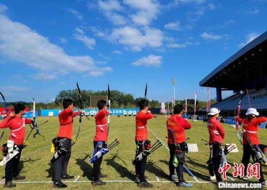國家體育訓(xùn)練南方基地(海南白沙·綜合),一輪射箭之后,運(yùn)動(dòng)員在查看中靶情況。中新網(wǎng)記者王曉斌攝