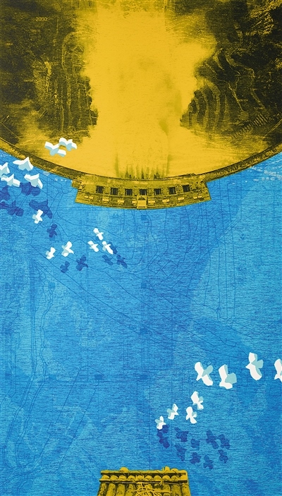 長(zhǎng)江兒女世世代代受江水潤(rùn)澤,也用智慧的靈光、創(chuàng)造的激情、拼搏的精神為長(zhǎng)江增光添彩。在長(zhǎng)江主題美術(shù)創(chuàng)作中,為追求美好生活而不懈奮斗的勞動(dòng)者、建設(shè)者,無(wú)疑是最生動(dòng)的主角。羅貴榮版畫(huà)《向海而生》、墨建杰版畫(huà)《白鶴灘水電站》、許鑫華中國(guó)畫(huà)《滬通長(zhǎng)江大橋》等作品,或刻或畫(huà),或概括或具象,塑造了一個(gè)個(gè)動(dòng)人的精神肖像,并通過(guò)對(duì)人物勞動(dòng)場(chǎng)景的描繪巧妙展現(xiàn)了壯麗山河的建設(shè)新貌。流淌于長(zhǎng)江血脈中的精神力量,也在畫(huà)筆下接續(xù)傳遞。趙培智油畫(huà)《纖夫》以象征的手法贊美了長(zhǎng)江兒女不懼艱難的堅(jiān)韌品格。黃勝賢油畫(huà)《百萬(wàn)遷移的世界壯舉》以紀(jì)實(shí)的敘事方式,謳歌了三峽庫(kù)區(qū)移民的奉獻(xiàn)精神。作品中,一個(gè)個(gè)懷揣夢(mèng)想又踏實(shí)肯干、堅(jiān)定沉著又樂(lè)觀自信的普通人形象,生動(dòng)地為觀眾解答了滔滔江水何以奔騰不息。