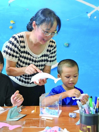廣西欽州三娘灣的小朋友在學(xué)習(xí)制作中華白海豚黏土模型。