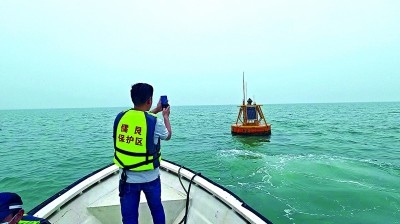 廣西合浦儒艮國家級自然保護區(qū)工作人員檢查海洋哺乳動物水下聲學(xué)監(jiān)測浮標。